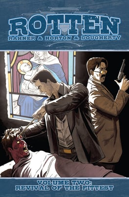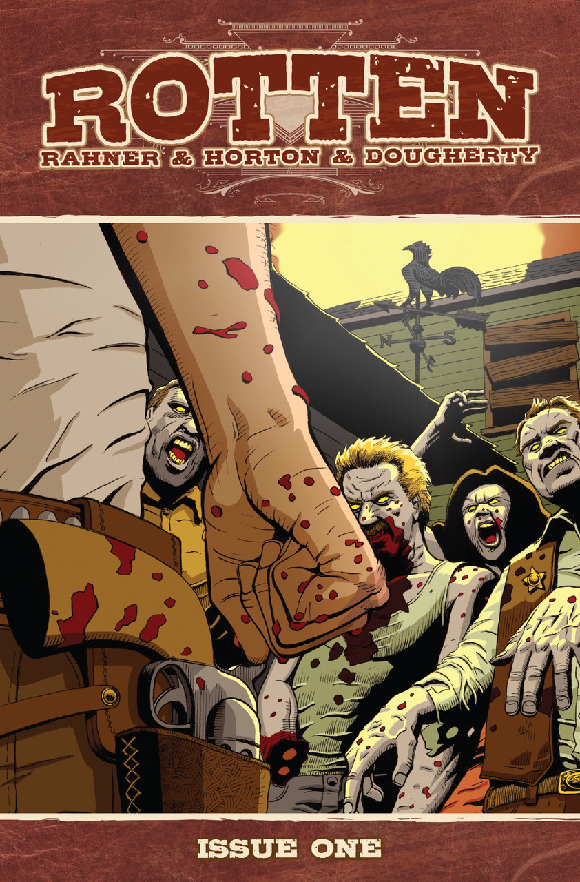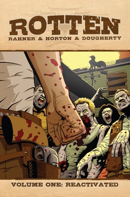 For the acclaimed zombie-western series, Rotten (created by Mark Rahner and Robert Horton), Eric created new trade dress for the title, as well as a complete upgrade of the layout and design for digital "Trade Paperbacks" released via ComiXology.